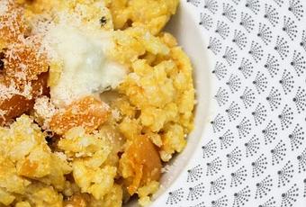 La courge n'est plus vraiment de saison mais elle se conserve longtemps si elle est bien conservée. Du coup, j'écoule mon stock avec ce riz au potiron et gorgonzola façon risotto.