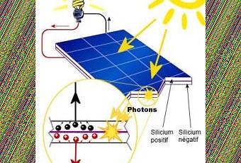 Le principe de fonctionnement d’un panneau photovoltaïque est semblable à celui d’une pile : une différence de potentiel est créée entre le pôle positif et le pôle négatif, ce qui permet aux électrons de circuler et de produire un courant électrique continu. Les électrons du silicium, matériau semi-conducteur qui compose les cellules photovoltaïques, ont la propriété de se mettre en mouvement sous l’effet du rayonnement solaire. Cette agitation en tous sens ne suffit pas à produire de l’électricité : pour cela, il faut produire une tension, grâce à une différence de potentiel entre un pôle positif et un pôle négatif, afin de faire circuler les électrons dans un sens bien précis. La différence de potentiel, nécessaire à la circulation du courant, est créée par le dopage du silicium : le dopage consiste à ajouter au silicium d’autres atomes, qui comportent plus ou moins d’électrons que le silicium, de façon à ce que le matériau présente un excès d’électrons (dopage de type N comme négatif) ou au contraire un déficit d’électrons (dopage de type P comme positif). La couche de la cellule exposée à la lumière est dopée avec des atomes de phosphore, qui comptent un électron de plus que le silicium. Cette couche, qui contient un excédent d’électrons (charges négatives), va constituer la borne négative. L’autre couche est dopée avec des atomes de bore (un électron de moins que le silicium), elle présente un déficit d’électrons, et constitue la borne positive. Les cellules sont couvertes de conducteurs. Dès que la lumière du soleil atteint la couche dopée N, les électrons se mettent en mouvement, et le courant électrique est créé et collecté par les conducteurs.