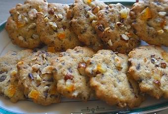 Disposer sur chaque cookie quelques éclats de noisettes et des dés d'orange confite.
