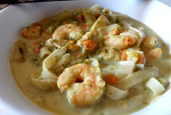 - Ajouter les pâtes, le cabillaud et les crevettes, cuire 4 mn.