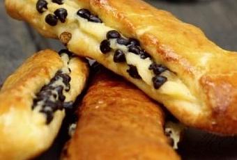 Enduisez une moitié de la longueur du rectangle de crème pâtissière. Parsemez par-dessus de pépites de chocolat.