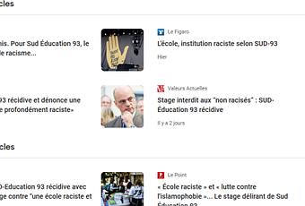 Si vous pensez que le racisme n'existe pas et/ou que c'est un sujet secondaire, et que vous ne savez pas ce qu'est la fachosphère, il vous suffira de taper dorénavant Sud Education 93 dans votre barre de recherche, et oh... Magie de l'internet ! Vous aurez désormais devant vos yeux tout esbaudis la fine fleur de la (non) pensée réac, d'extrême-droite et raciste de fRance... Boulevard Voltaire, Breizh-info, Valeurs Actuelles, Le Figaro, Le Point, Marianne ... Rien que des sites d'information progressiste, mazette ! 😉
