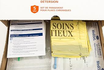 - des sets adaptés à la prise en charge des plaies chroniques, à la phase de cicatrisation (ex: Set pour la phase « Détersion ») et au type de plaie (ex: Set « Méchage » pour les plaies chroniques cavitaires).