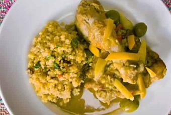 Enfin servez votre plat de poulet avec du riz - blé ou semoule selon votre choix - et décorez avec des tranches de citron confit.