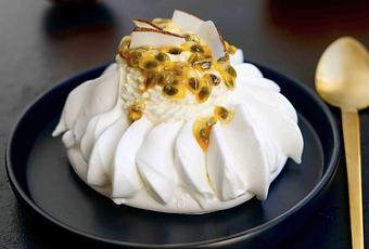 Remplissez le centre de chaque meringue avec le crémeux , recouvrez avec de la chantilly . Coupez les fruits de la passion , récupérez la pulpe et répartissez la sur les pavlovas. ajoutez des copeaux de noix de coco.