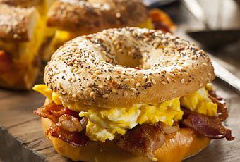 Une recette de bagel pour le petit-déjeuner ou pour un brunch gourmand. Le petit pain rond accueille des œufs brouillés et du bacon grillé, dans la plus pure tradition.