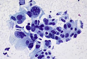 Cellules de cancer du poumon non à petites cellules. Ces cellules présentes pratiquement toutes les caractéristiques cardinales de la malignité: variation marquée de la dimension et de la forme du noyau, une chromatine irrégulièrement distribuée et de grands et importants pronucléi. Certaines cellules tumorales (...) étant positives pour p63 et négatives pour TTF1-alpha par immunohistochimie, le diagnostic final était: carcinome à cellules squameuses peu différenciées.
