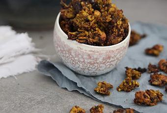J'aime beaucoup le granola, que je consomme en snack, en topping sur les soupes, des yaourts, etc. Avec sa texture bien croquante et son petit goût délicieusement épicé de reviens-y, celui-ci est parfait à présenter à l'apéritif, en alternative aux chips et autres biscuits cracra.