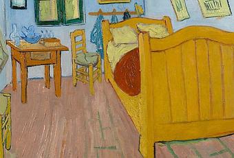 La chambre à coucher représente la chambre de Van Gogh à Arles. L'artiste lui-même a décrit cette peinture comme une invitation à la paix et à la détente. La chambre dispose d'un mobilier en bois simple et de ses propres oeuvres d'art accrochées aux murs.