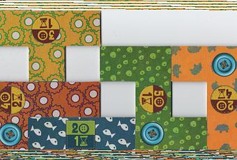 Quand on prend une pièce, on a le choix entre les 3 placées juste après le pion neutre. On déplace ensuite ce dernier à la place du tissu choisi. Mais attention, il va falloir payer le prix en boutons indiqué sur la pièce. Et celle-ci vous permettra de vous déplacer du nombre de cases indiqué près du sablier. On place ensuite la pièce achetée sur son plateau de jeu.