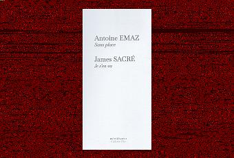 Dans la collection « Duo » dont c’est le deuxième titre, les éditions méridianes publient un livre à deux voix, celles d’Antoine Emaz et James Sacré. Lorsqu’on ouvre la couverture rigide à quatre volets dont les deux extérieurs servent de rabats, apparaissent deux livrets de 16 pages chacun, posés symétriquement, élégamment cousus à cette couverture. On peut en supposer que ces deux voix se feront écho sans présumer que les poètes aient croisé leurs textes : disons que l’amitié et la connaissance réciproque de leur travail sont une raison suffisante de rassembler ces auteurs. En l’occurrence, si le poème de Sacré incorpore le nom d’Emaz, le texte de celui-ci ne fait pas allusion au premier.