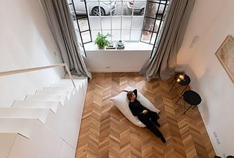 En termes de matériaux, un plancher en chêne naturel en forme de chevron est installé dans tout l’appartement, sauf dans la salle de bains et les toilettes, où il remplacé par du terrazzo. Pour l’éclairage artificiel, l’architecte a préféré utilisé de l’éclairage indirect, plus doux et qui permet de mettre en valeur les grands volumes de l’appartement.