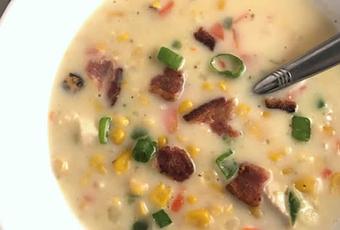 Enfin servez votre soupe chaude, saupoudrez avec des tranches de bacon et ciboulette ciselée et bon appetit avec la recette soupe poulet et maïs ww.