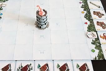 Chaque joueuse/eur reçoit un plateau de jeu avec 1 tuile Cimetière, 5 tuiles Maison (le Village), 6 tuiles Piège composées de 2 Murs, 2 Catapultes, 1 Dragon et 1 Trésor. Superposez les 4 étages de votre Tour au centre de votre plateau et placez-y votre Héros au sommet.