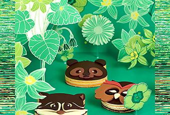 Le raton laveur praliné noisettes (2 personnes) : Biscuit amande, ganache chocolat noir, crème mousseline praliné amande noisette, masque en chocolats blanc vanille, noir et lait. 15 €