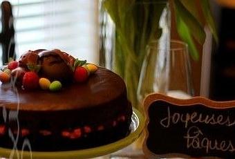 20)Garnir le gâteau d’oeufs en chocolat, de framboises et de menthe. Servir avec le reste du coulis de framboises.
