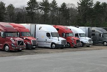 Une série de Volvo et de Freightliner dans un truck stop, un porte-voiture.