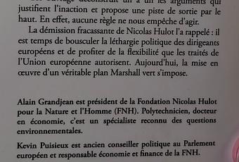 Cher Alain, merci pour ce livre dont je n'aurais pas changé une lettre si j'avais du l'écrire. C'est un vrai manifeste à s'approprier d'urgence, pleins de solutions concrètes et implémentables pour permettre la transition écologique en Europe. Les idées d'Alain Grandjean, Marion Cohen et Kevin Puisieux ont l'élégance de pouvoir mettre d'accord les progressistes comme les conservateurs et les comptables, en proposant un moyen réaliste d'investissement public massif sans sortir des traités.