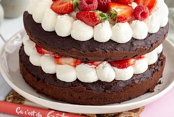 J'étais très tentée par le gâteau en couverture mais je n'avais pas envie d'un gâteau à 3 étages car nous ne sommes pas assez nombreux à la maison, j'ai donc pris la recette du gâteau tout choco au cacao et à la courgette qui donne un rendu super moelleux. Pour la garniture, j'ai réalisé une chantilly à la noix de coco (très simple à faire) et mis tout ce que je pouvais de fraises et de framboises.