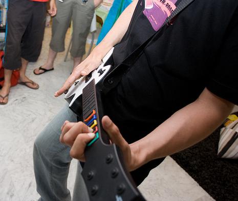 La guitare Wii est … moche. Surtout comparée à certaines autres. Alors quand lors d’une soirée, on lance un “eh bouge pas on va prendre des photos un peu” - effroi total. Mais finalement le resultat n’est pas mal du tout (si on pardonne les enjoliveurs pédestres des deux personnes dans le fond).