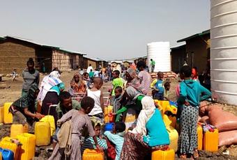 Des personnes déplacées s’approvisionnent en eau à des réservoirs installés par le CICR, à Iyemba Photo : Zerihun Legesse – CICR