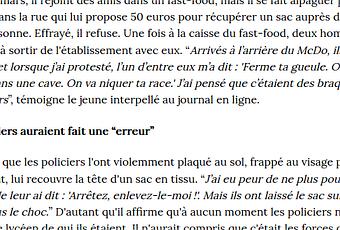 Il parait que l'IGPN aurait été chargé d'une enquête sur cette " bavure " (décidément, en ce moment yen a un peu beaucoup...). Mais qu'attendre de gens qui sont à la fois juges et partie ? Moi, rien. Mais je songe à cette racaille d'Alliance Police, un être immonde qui ose justifier sans le moindre état d'âme cette saloperie là :
