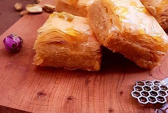 - عند إخراج البقلاوة من الفرن تسقی مباشرة بالعسل حسب الحاجة ونتركها تبرد.