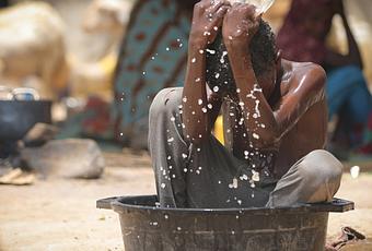 Contraint de se laver avec de l’eau sale. Camp d’Al Malika de déplacés à l’est de Taïz. Depuis le début du conflit, 2 millions de Yéménites ont du fuir leur foyer.