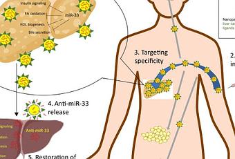Étapes Suggérées dans l’Administration de Anti-miR-33 Nanoencapsulé dans le Ciblage du Foie.1= Nanoencapsulation2= Injection Systémique3= Ciblage Spécifique4= Relâchement de Anti-miR-335= Restauration d’un phénotype métabolique sainL’anti-miR-33 pourrait porter secours au foie atteint de stéatose (foie gras) lorsqu’administré à l’organisme entier. L’augmentation de la concentration en miR-33 inhibe l’expression des gènes dans le foie qui, autrement, stimulerait la signalisation insulinique, l’oxydation des FA, la biogénèse de HDLs, et la sécrétion de bile. L’anti-miR-33 inverse ces effets métaboliques du miR-33 et sauve le foie gras et des effets délétères en aval. (…). Abréviations : FA, acides gras ; HDL, lipoprotéine de haute densité ; WAT, tissu adipeux blanc
