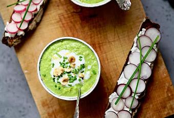 Pour servir , versez la soupe dans des bols ,ajoutez une cuillère de lait ribot , des noisettes concassées , de la ciboulette et le zeste d'un citron bio .