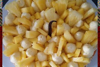 - Répartir les dés de mangue autour des pointes de crème puis insérer régulièrement des morceaux d'ananas.