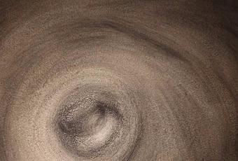 L’idée de partir d’une surface noire pour y faire progressivement naître la lumière n’est pas si fréquente ; Courbet, avec ses préparations de noir de bitume, y excellait – c’est ce qui donne à ses paysages forestiers une atmosphère particulière et réserve bien des cauchemars aux conservateurs de musées tant leur éclairage se révèle délicat. Mais il s’agissait de peinture. Ici, Jacques Rouby s’attaque à la matière même, crée des formes abstraites, inquiétantes, envoutantes et parfois cependant légères, à partir d’une parfaite obscurité, quand il n’y imprime pas des textes et photographies issus de feuilles de journaux. L’œil du spectateur, d’abord pris de sidération devant cette image très inhabituelle et diablement esthétique, doit apprivoiser la matière, décrypter les graphismes qui lui suggèrent parfois une cartographie de lieux inconnus, d’autre fois des nébuleuses ou des galaxies lointaines ou encore le dialogue impromptu entre des visages humains et des formes moins facilement identifiables issues de magazines. Dans un premier temps, la curiosité aiguisée, on aimerait connaître le secret technique de ces créations, puis on se prend à aimer que l’artiste ait emporté ce mystère avec lui, réservant le meilleur à la postérité, la part du rêve.