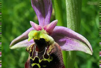 Ophrys fuciflora (Ophrys bourdon) : tige verte ; feuilles inférieures en rosette, les supérieures engainantes ; bractées foliacées ; inflorescence lâche ; fleurs grandes, sépales lancéolés rose plus ou moins foncé, parfois blancs, souvent marqués d'une nervure verte, pétales très petits, triangulaires, de même teinte que les sépales, finement pileux, labelle entier, plus large que long, brun-rouge, gibbosités plus ou moins marquées, macule de forme et de couleur variable, appendice jaune-vert redressé vers l'avant. Espèce protégée en Meurthe et Moselle.