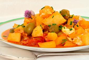 Contrairement à la recette traditionnelle, à la place d'un coulis de tomates, j'ai utilisé des tomates cerise, et j'ai rajouté des olives à mi-cuisson.J'ai utilisé des olives vertes Bio dénoyautées ail et persil, de la nouvelle gamme Bio Tramier pour l'apéro. Goût subtil et chair savoureuse, ces olives vertes de la variété Halkidiki sont cultivées à Kalives, en Grèce.L'ail et le persil leur donnent encore plus de goût et conviennent parfaitement à mon ragoût.L'occasion aussi pour moi de vous présenter ce magnifique couteau noir Kypto Black de Cook Ut qui coupe comme cela n'est pas permis et dont je ne me passe plus.Deux fois plus léger qu’un modèle traditionnel, ce couteau en céramique est agréable à utiliser avec son manche ergonomique. (tous les détails ici).Deux façons de finaliser ce plats : le servir tel quel pour une version vegan ou rajouter des oeufs en fin de cuisson pour une version végétarienne.Au choix de chacun.