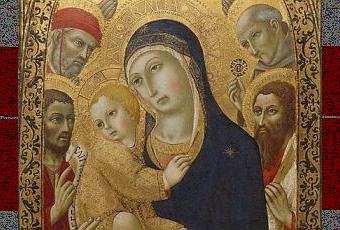 Sano di Pietro a mis au point ce type très compact de Madonne, dans lequel les Saints passent à l’arrière-plan, réduits à un visage auréolé et à un attribut distinctif.