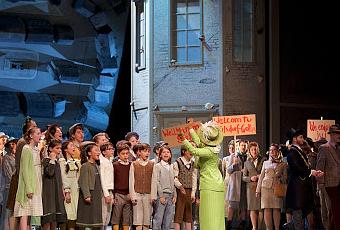 Brigitte Fassbaender, entourée d'une équipe inventive, réussit ici une de ses meilleures mises en scène, elle fait preuve d'un art consommé de la disposition des nombreux personnages qui animent constamment la scène. Car c'est toute la population d'une petite ville qui est au centre de l'argument, ce qui rend le travail du positionnement et des mouvements si importants. La metteure en scène est aidée en cela par l'assistance chorégraphique efficace d'Alessio Atanasio. Les décors et les costumes de Dietrich von Grebmer sont des plus réussis et rendent parfaitement l'atmosphère d'une petite ville provinciale à la parade dans le meilleur esprit de l'opéra comique. Ainsi pour le thé de la Baronne de la belette verte : le grand salon de la baronne est décoré d'une grande théière pour le five o'clock, et toutes les dames arborent des tenues vertes. Ainsi encore de l'intérieur de la maison de maître de Sir Edgar, dont tous les murs sont décorés de fresques représentant une jungle très colorée. Brigitte Fassbaender anime les passages orchestraux qui occupent les transitions entre les scènes par des protections vidéos projetées sur une toile d'avant-scène, ce qui permet des changements de décors insensibles: Raphael Kurig et Thomas Mahnecke ont filmé la maquette d'une petite ville et nous font circuler en survol par les rues et les places organisées autour de l'inévitable clocher