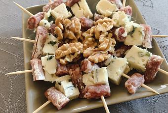 Voici les dernières brochettes de la série de celles préparées pour mon anniversaire... On marie ici des mini-saucisson, du roquefort, et des cerneaux de noix.