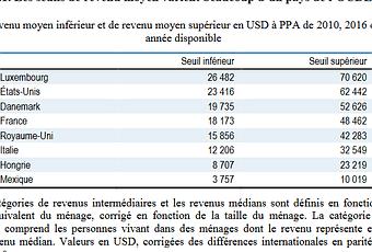 Dans ce billet, qui n'a pas vocation à devenir une publication académique de haut niveau, mais juste de fournir au lecteur quelques éléments de réflexion, nous adopterons une définition large qui permet des comparaisons internationales dans les rapports de l'OCDE : la classe moyenne (appelée « catégorie des revenus intermédiaires » en jargon OCDE) est constituée des personnes qui vivent dans des ménages dont les revenus représentent entre 75 % et 200 % du revenu médian national, ce dernier représentant le revenu qui partage la population en deux groupes, ceux qui ont plus et ceux qui ont moins. De là découle la notion de classe moyenne inférieure (75 % à 100 % du revenu médian) et de classe moyenne supérieure (150 % à 200 % du revenu médian).