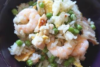 Ajouter les crevettes, le poulet, les petits pois et l'omelette.