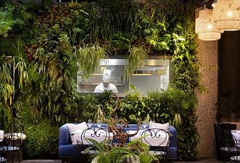 La salle de restaurant, sous sa magnifique verrière, est dans le ton de l’ensemble. Mur végétal, tons pastel pour le mobilier confortable, lumière naturelle et ouverture à l’air libre aux beaux jours. On a envie de se mettre à table, de prendre son temps et de déguster la cuisine du chef Ricardo Lucio qui est en harmonie avec ce décor.