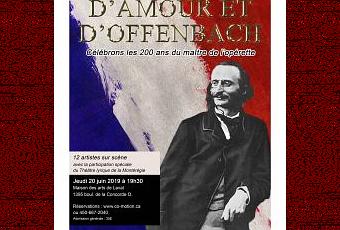 Sur le thème D’Amour et d’Offenbach et sous la direction artistique du sopraniste Étienne Cousineau, la compagnie lyrique Productions Belle Lurette célébrera le jeudi 20 juin 2019 le 200e anniversaire de naissance du maître française de l’opérette à l’occasion d’un concert unique pendant lequel pourront être entendus des airs tirés notamment de La belle Hélène, de la La Grande-Duchesse de Gerolstein et de La vie parisienne. De Moulin Rouge, et son célèbre cancan, à la barcarolle du film La vie est belle, en passant par le message téléphonique de Monsieur Pignon dans Le dîner de con, la musique de Jacques Offenbach est encore aujourd’hui bien présente dans la culture populaire. Le concert permettra d’entendre ou de réentendre ces succès et d’en découvrir ou redécouvrir de nouveaux. L’évènement rassemblera plus de 15 artistes lyriques ainsi que les membres du Choeur du Théâtre lyrique de la Montérégie, fêteront la carrière prolifique de celui qui a su si bien mettre en musique la folie du Second Empire.