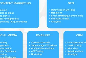 Le content marketing : il s'agit de savoir créer du contenu pertinent pour l'audience principalement via un site internet qui permettra de générer du trafic par la suite. Le content marketing peut notamment être pris en charge par des rédacteurs web chargés de rédiger des articles qui viendront alimenter le site web ou le blog de l'entreprise.