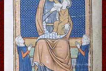 On suppose qu’il s’agit ici d’un père priant pour l’âme de son fils mort ([8], p 111) Le croisement des regards, parallèles aux accotoirs du trône, traduit bien le dialogue muet : le père humain implore la mère divine d’intercéder auprès de l’enfant divin pour qu’il accueille l’enfant humain.