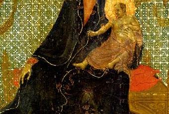 Duccio s’inspire ici de modèles byzantins pour introduire dans sa Madonne en majesté les prémisses d’une iconographie qui ne se développera en Occident que quelques années plus tard et sous l’influence cistercienne, celle de la Vierge de Miséricorde (voir 2-2 La Vierge de Miséricorde).