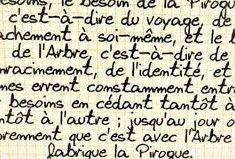 c'est-à-dire du voyage, de l'arrachement à soi-même, et le besoin de l'arbre, c'est-à-dire de'enracinement, de l'identité, et les hommes errent constamment entre ces deux besoins, en cédant tantôt à l'un, tantôt à l'autre, jusqu'au jour où ils comprennent que c'est avec l'arbre qu'on fabrique la pirogue.