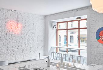 Ils sont parvenus à créer un espace convivial et agréable dans lequel les clients se sentiraient bien. Cela se reflète dans le choix des meubles, de l’éclairage et des sols. Quelques vieux bancs de travail et tabourets chinés, plusieurs vieux réfrigérateurs qui gardent le vin frais, et même les murs, presque tout ici est blanc. Cela a donné à l’ensemble de l’espace un aspect unifié qui joue avec la lumière et les ombres pour se texturer.