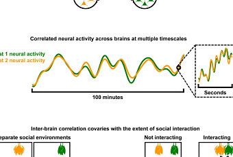 Des interactions sociales surviennent entre de multiples individus, mais quelle relation y-a-t-il avec la dynamique de leurs neurones au niveau de leurs cerveaux ? Afin de poser cette question à travers diverses échelles de temps et divers niveaux d’activité neurale, nous en avons enregistré l’activité électrique chez des couples de chauves-souris engagées dans des interactions sociales variées, à l'aide d'une technique d'électrophysiologie sans fil. Nous avons mis en évidence que l’activité neurale était en remarquable corrélation entre leurs cerveaux sur des laps de temps s’échelonnant entre quelques secondes et quelques heures. Nous avons établi que la corrélation dépend de l’environnement social partagé ; elle particulièrement forte en cas de potentiels de champs locaux de haute fréquence (>30 Hz), suivis d’une activité de pointes (modification du potentiel d’action) locale. De plus, nous avons montré que le degré de corrélation neurale varie en fonction de l’étendue des interactions sociales, et qu’une augmentation de cette corrélation correspond au déclenchement d’une phase d’interaction sociale. Ces résultats révèlent que la corrélation inter-cérébrale est une caractéristique inhérente aux interactions sociales naturelles, ils révèlent le domaine d’activité neurale dominant, et fournissent les fondements pour l’étude de son rôle fonctionnels dans les comportements sociaux. Wujie Zhang et Michael M. Yartsev, dans Cell, publication en ligne en avant-première, 20 juin 2019
