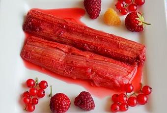 J'ai servi mes bâtons de Rhubarbe gorgés de jus de groseilles à la verveine citron avec quelques fruits rouges.