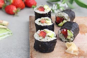 Préparer la garniture : Laver les fraises et les couper en quatre ou en six, selon leur grosseur. Couper la courgette en bâtonnets.Préparer les makis : Poser une feuille de nori, partie rugueuse sur le dessus sur une natte en bambou, une feuille de silicone (voir du film alimentaire). Humidifier vos mains et étaler du riz sur la surface, en appuyant bien et en laissant un peu d'algue libre. A l'aide d'une petite cuillère, faire une "ligne" de pesto, y disposer les morceaux de fraises, les bâtonnets de courgette et les graines germées si vous en utilisez.