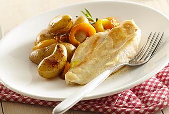 - DRESSEZ les assiettes avec les pommes de terre, le poulet et les poivrons. Salez et poivrez.